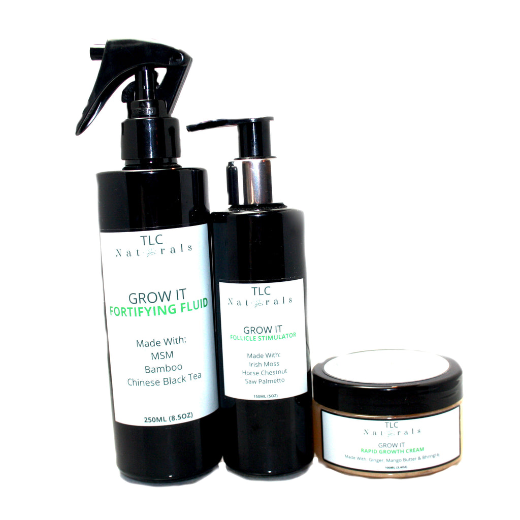 The Trio Bundle includes the Grow It Fortifying Fluid, Grow It Rapid Growth Cream, Grow It Follicle Stimulator PLUS, a sweeter 15% DISCOUNT!!